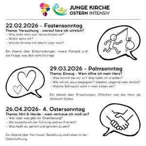 Mit der Reihe „Junge Kirche – Ostern intensiv“ laden wir Jugendliche und junge Erwachsene ab 16 Jahren ein, diesen Weg bewusst mitzugehen. In drei thematischen Sonntagabenden von der Fastenzeit bis in die Osterzeit wollen wir gemeinsam essen, ins Gespräch kommen, das jeweilige Sonntagsevangelium betrachten und den Abend mit einem geistlichen Impuls und Segen beschließen.