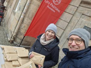 50 Pakete mit Dingen, die den Einstieg in die Fastenzeit verschönern sollen, wurden am 18. Februar vor der Gaukirche von Dominik Kräling und Alexandra Boxberger von der City Pastoral verschenkt.