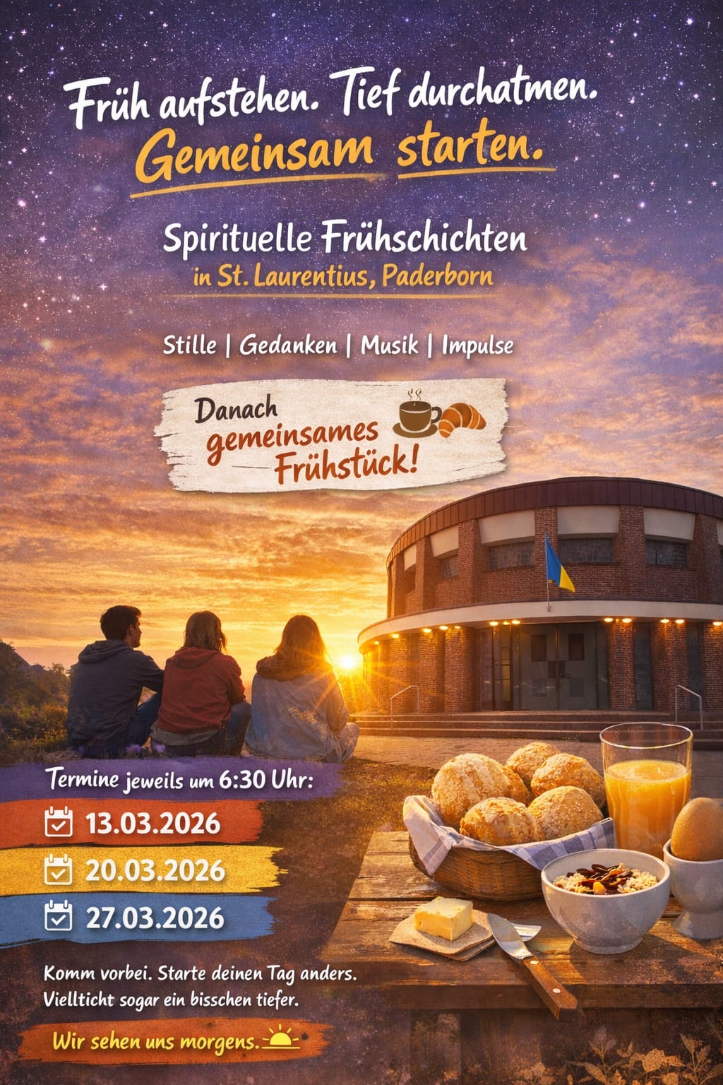 Wie schon in den vergangenen Jahren laden wir dich zu den spirituellen Frühschichten in St. Laurentius, Paderborn ein – ein Moment zum Runterkommen, Auftanken und Durchstarten.