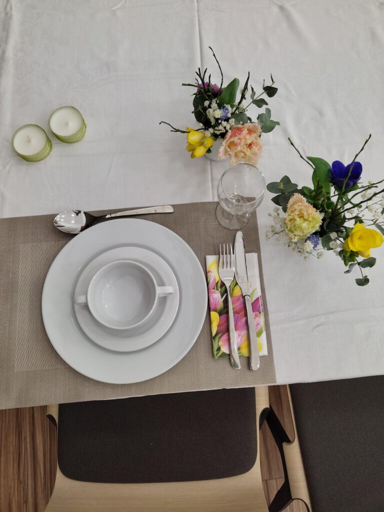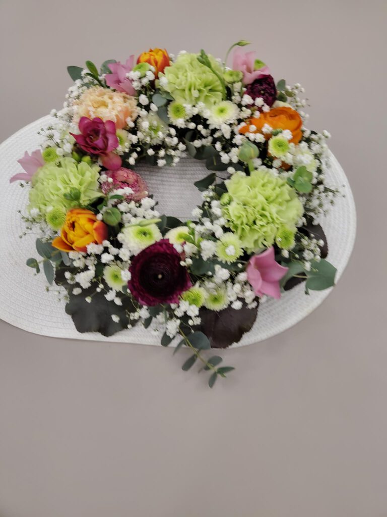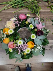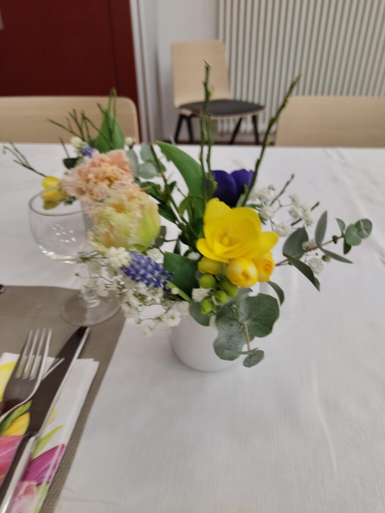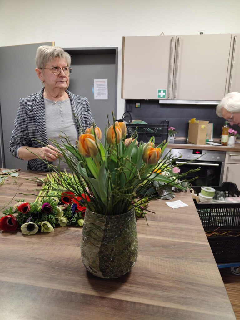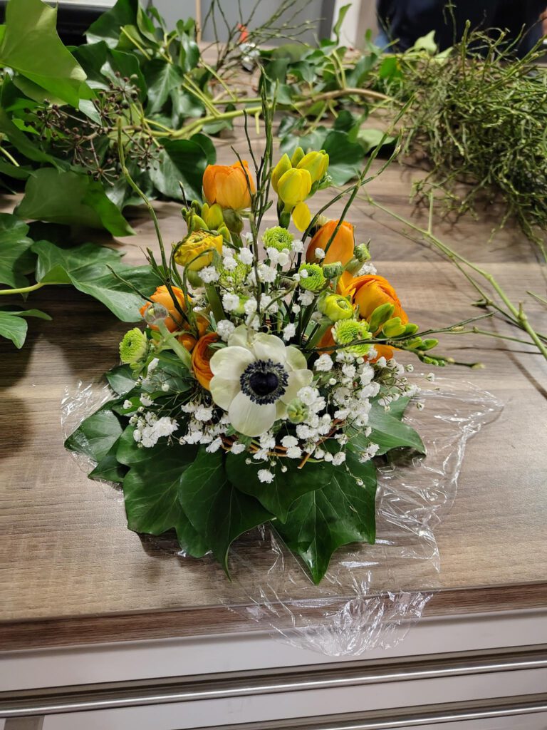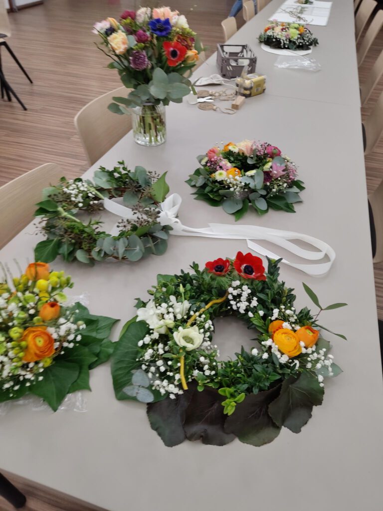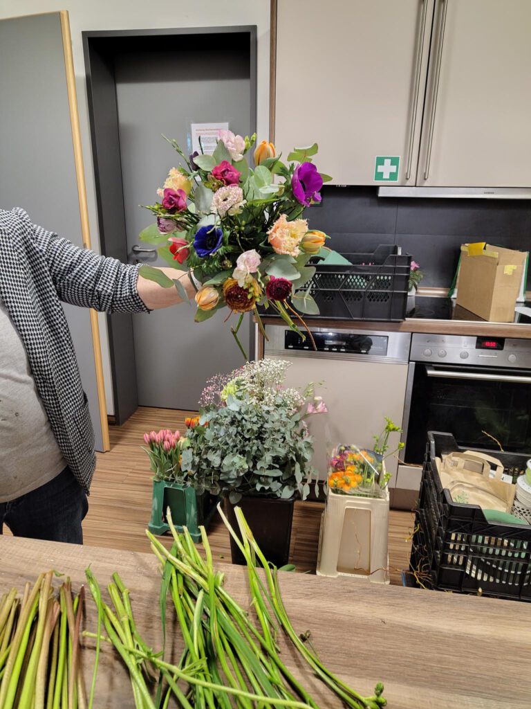 Der richtige Anschnitt der Blumen sowie Stecken und Binden wurden ausführlich besprochen und praktisch probiert. Auch die Wahl der passenden Vase oder eines geeigneten Gefäßes, das als Vase genutzt werden kann, wurde thematisiert, da dies einen entscheidenden Unterschied im Gesamteindruck macht.