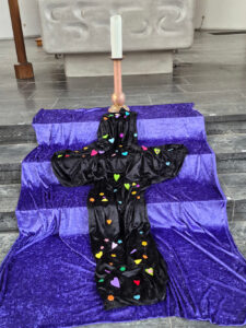 Rund 150 Kinder und Erwachsene fanden sich ein, um diesen besonderen und ruhigen Feiertag gemeinsam zu begehen. Am Eingang bekamen alle eine kleine Überraschungstüte ausgehändigt, darin ein Gebet, ein Kreuz zum selber basteln und einige andere Dinge, um den Gottesdienst mitzugestalten. Am Ende war das dunkle Kreuz vor dem Altar reich geschmückt: Als Zeichen der Hoffnung auf die Auferstehung.