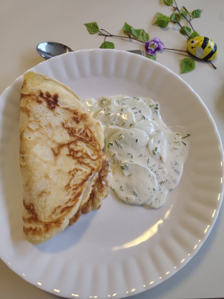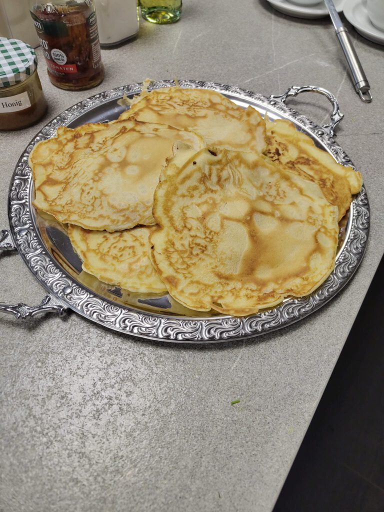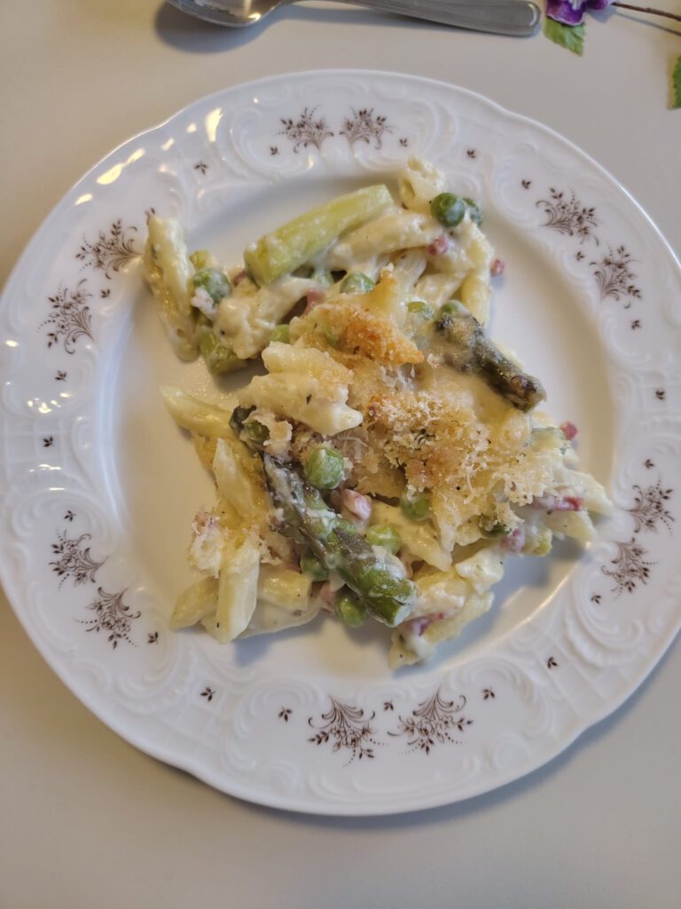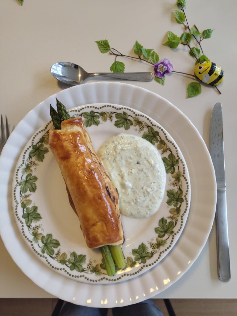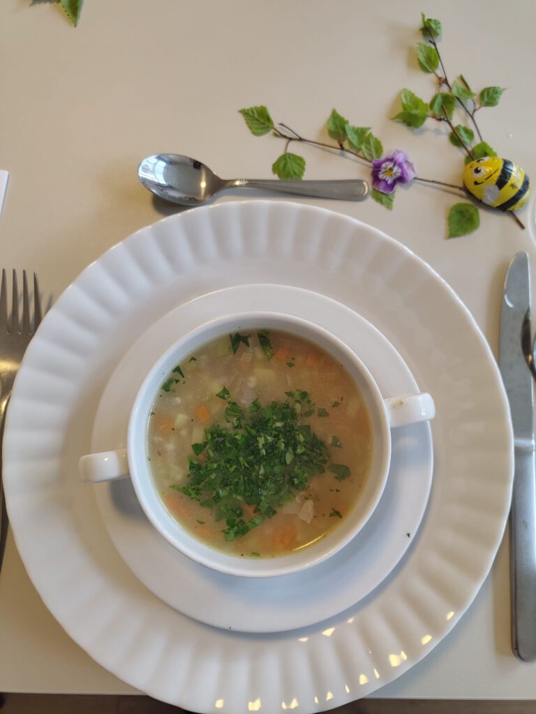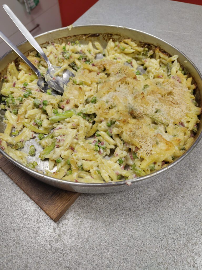 Die Rezepte fügten sich zu einem harmonischen 6-Gänge-Menü zusammen. Den Auftakt machte eine feine Graupensuppe, bei der das klein geschnittene Gemüse optisch mit den Graupen harmonierte. Knuspriger Blätterteig ummantelte die Spargelpäckchen, die mit einem frischen Kräuter-Feta-Dip serviert wurden. In einem köstlichen Pfannkuchen mit Gurkensalat versteckte sich eine Scheibe gekochter Schinken. Das Tomaten-Carpaccio überzeugte mit einem aromatischen Dressing, das die hauchdünn geschnittenen Tomatenscheiben perfekt ergänzte. Ein Nudelauflauf mit knuspriger Parmesankruste rundete die herzhaften Gänge perfekt ab. Mutiges Nachwürzen war beim Auflauf erforderlich, bis der perfekte Geschmack erreicht wurde. Den krönenden Abschluss bildete eine Quarkspeise mit Sauerkirschen.