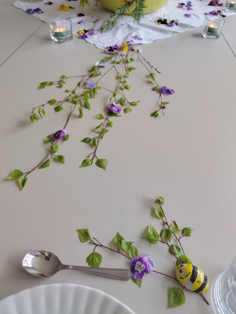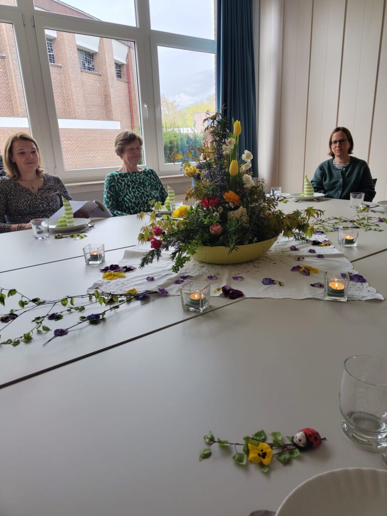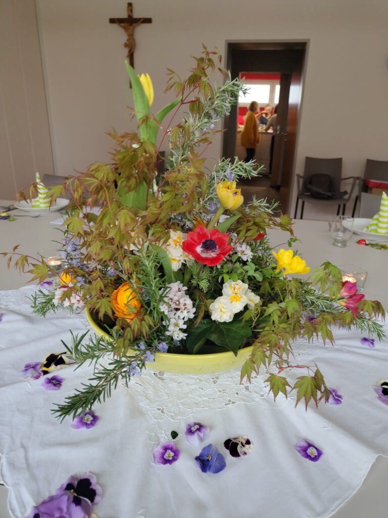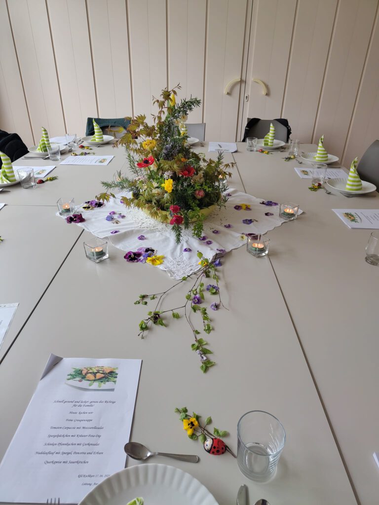 Die Tischdekoration spiegelte den Frühling in seiner ganzen Farbenpracht wider. Alles, was gerade im Garten sprießt, fand seinen Platz — von Ahornzweigen über prächtige Blüten bis hin zu Hornveilchen, die den harmonischen Übergang von der Tischmitte bis hin zu einzelnen Gedecken zauberten. Fachfrau Lydia Lüke hat wieder einmal mit viel Kreativität für eine wunderschöne Atmosphäre gesorgt.