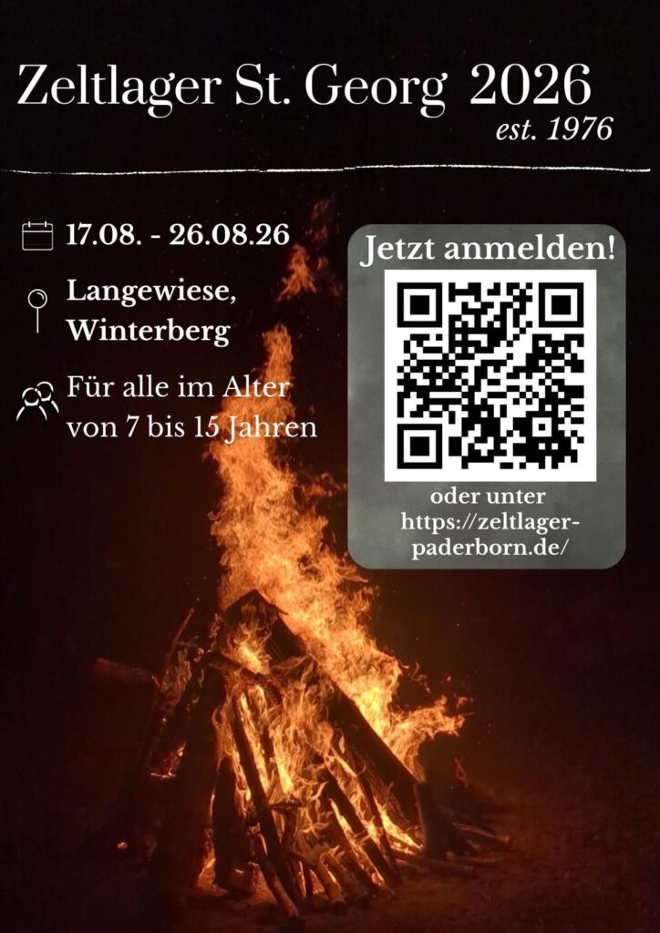 Das Team des Zeltlagers St. Georg freut sich sehr auf das Zeltlager vom 17.08. bis 26.08.2026. Das Zeltlager richtet sich an Kinder im Alter von 7 bis 15 Jahren. Der Teilnahmebeitrag beträgt 280 €.
