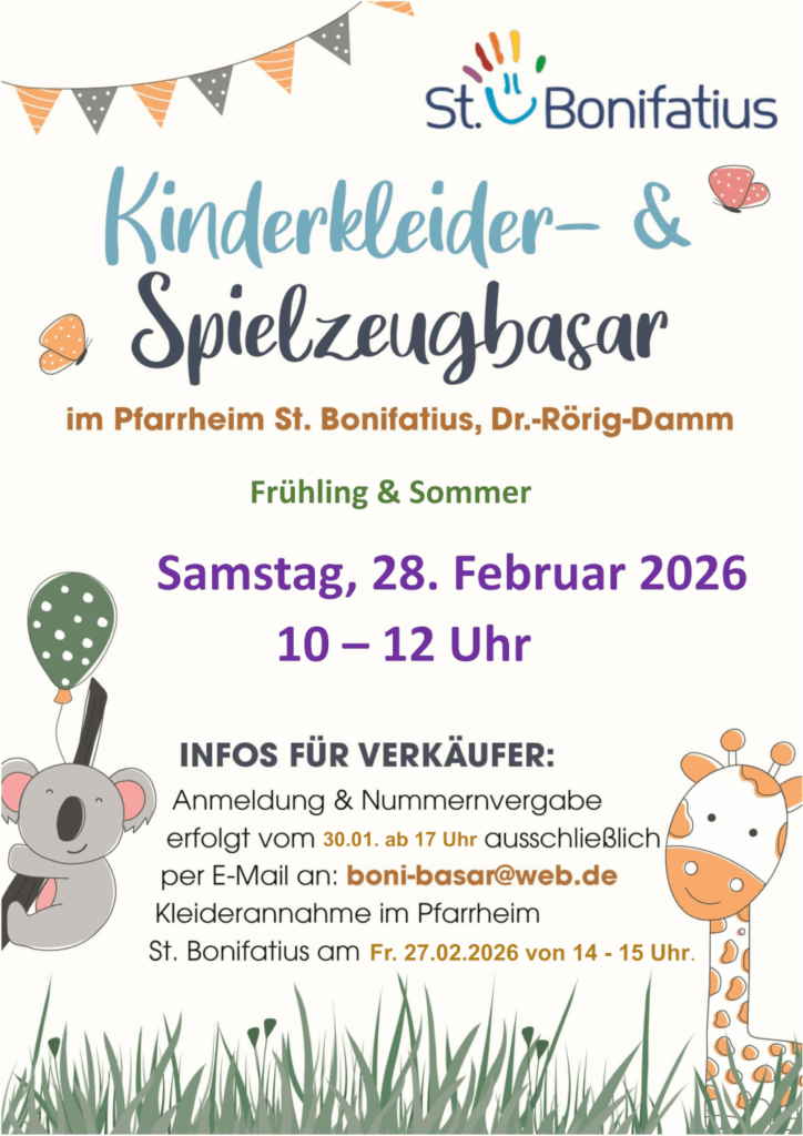Die Anmeldung und Nummernvergabe erfolgt vom 30.01.2026 ab 17:00 Uhr ausschließlich per E-Mail über boni-basar(hier bitte ein At-Zeichen einsetzen)web.de. Die Kleiderannahme erfolgt im Pfarrheim St. Bonifatius am Freitag 27.02.2026 von 14:00 bis 15:00 Uhr.